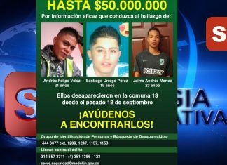 La Alcaldía de Medellín, la Policía Nacional y la Fiscalía anunciaron una recompensa de 50 millones de pesos para quien dé información sobre Jaime Andrés Manco, Andrés Felipe Vélez y Santiago Urrego Pérez, tres jóvenes del barrio Belencito Corazón, Comuna 13 de la Ciudad, que desaparecieron el 18 de septiembre.