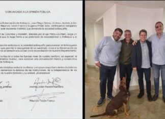 Los precandidatos a la Gobernación de Antioquia Juan Diego Gómez Jiménez, Andrés Julián Rendón Cardona, Mauricio Tobón Franco y Eugenio Prieto Soto invitaron a las fuerzas vivas del Departamento y, en especial, al precandidato Luis Fernando Suárez, a unirse en torno a la defensa de las instituciones, de la independencia de los poderes públicos y del territorio.