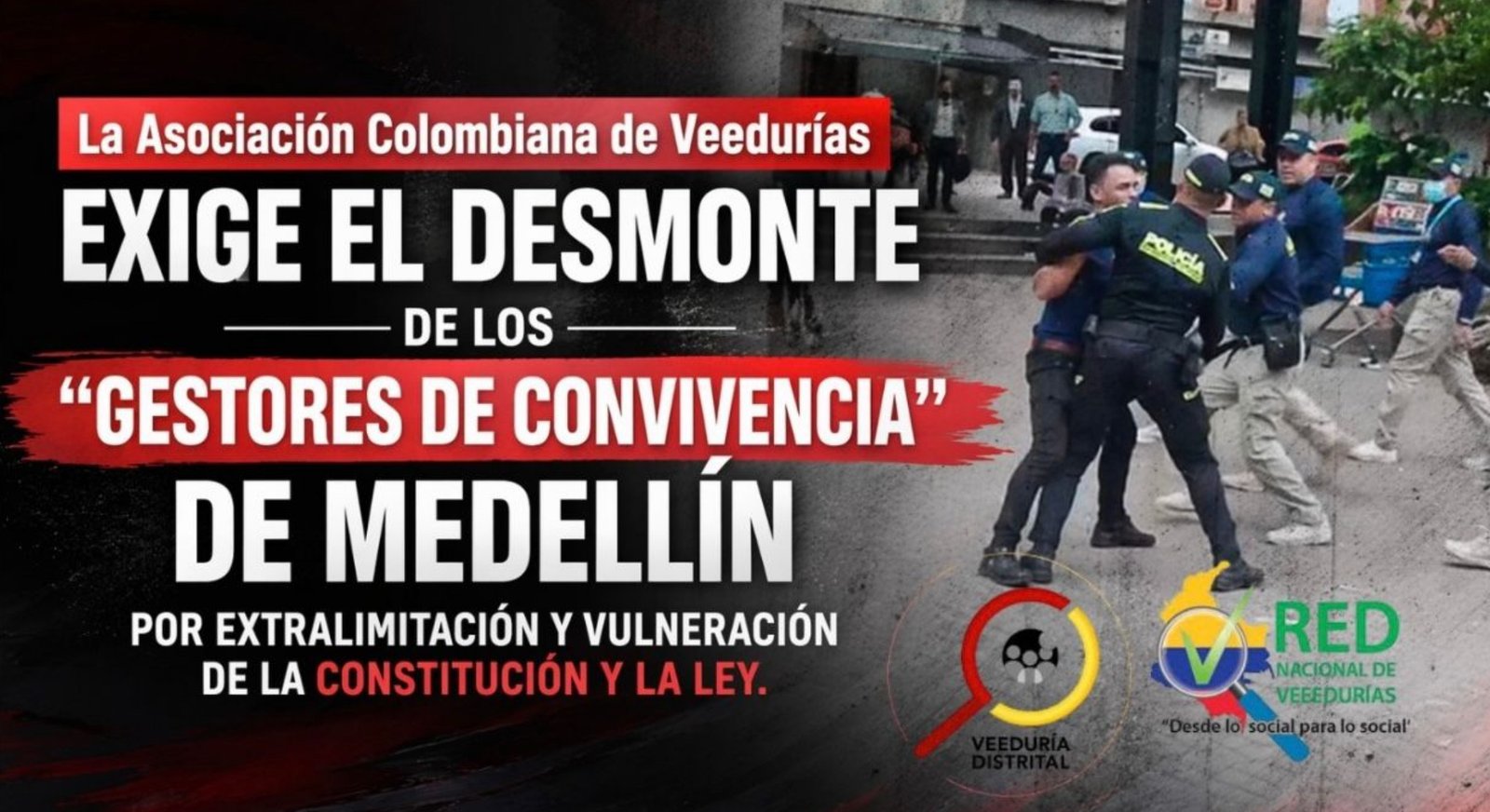 La Asociación Colombiana de Veedurías solicitó el desmantelamiento inmediato del grupo denominado “gestores de convivencia”, implementado por la Alcaldía de Medellín, al considerar que sus actuaciones estarían generando temor ciudadano y posibles vulneraciones a los derechos humanos, al actuar como un grupo “para policial”.